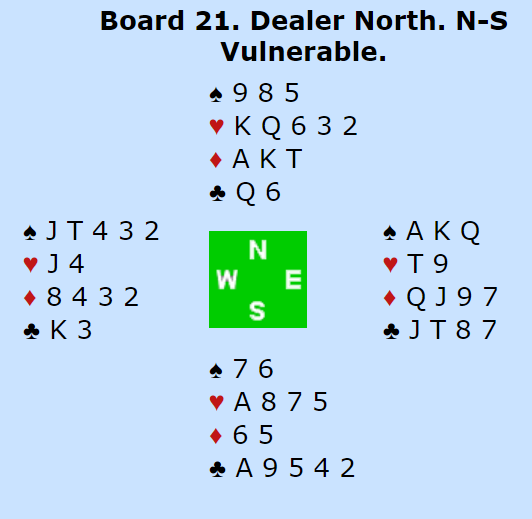 N/S har bare 23 HP til sammen og ikke spesielt skjev fordeling, men likevel er det ti enkle stikk i 4 hjerter slik det sitter. Det ga 86 % til lederparet. Å spille 3 hjerter med ti stikk ville gitt 31 %.