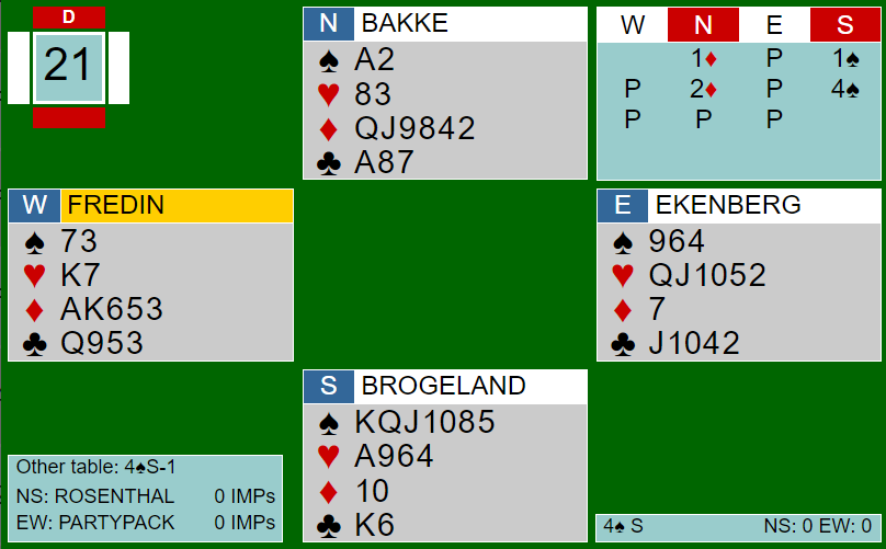 Her er et spill fra torsdagens spilling som viser hvor små marginene av og til er, og hvordan en avgjørelse som i parturnering kan synes fornuftig påvirker resultatet mye.