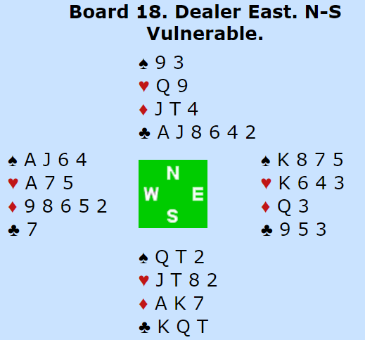 Noe over halvparten av N/S parene meldte og vant lilleslem. Noen veldig få gikk bet i 6 spar, og ved et par bord ble det bet i 7 spar. Resten var i uganger.