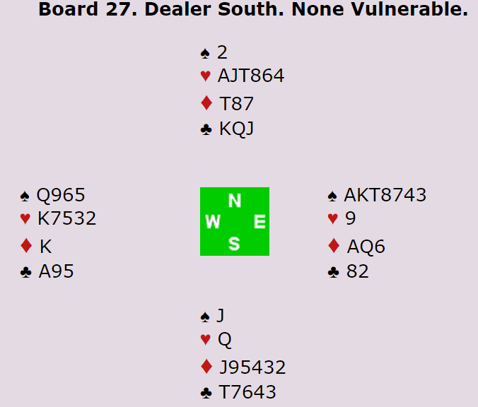 Av de åtte kvartfinalelagene havnet syv Ø/V par i 3NT, alle etter 3 hjerter i åpning fra syd og 3NT innmelding fra vest. Ved ett bord ble kontrakten 4 spar. Der åpnet imidlertid syd med 4 hjerter. Da har ikke vest noe særlig annet å gjøre enn å doble, for i den situasjonen har han ikke til rådighet den naturlige 3NT meldingen. Slik så hele spillet ut: