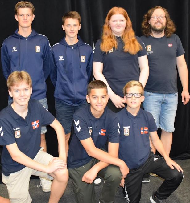 U-16 laget: Stående fra venstre Einar Osen, Kristian Dalemark Austad, Ida Kristine Mathisen og Kristian B. Ellingsen (NPC). Foran fra venstre: Jonas Brekke, Sebastian Lillejord og Markus Hansen Moe. (Foto: Ragna Gunn Bye)