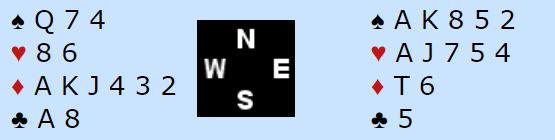 Dette er vel egentlig litt tynt for slem, men med veldig snill sits, 3-2 både i ruter og spar, kan det noen ganger bli tretten stikk i sparkontrakt. I meldingene fikk imidlertid Ø/V vite at det sannsynligvis ikke satt så snilt. Nord passet og øst åpnet med 1 spar før syd hoppet inn med en sperremelding, flere steder 4 kløver, noen steder 5 kløver. Da er det ikke så lett å melde med styring.