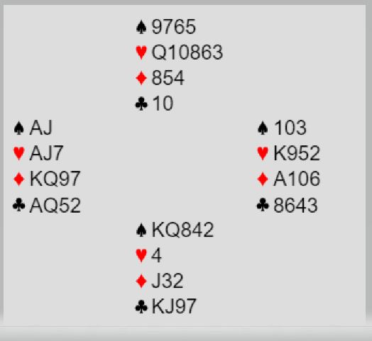 Det var også syv par som vant gullkontrakten 3NT hvor det er ni sikre stikk siden ruteren sitter 4-3. Spar konge kan hentes ved hjelp av innkomsten til syd på hjerter 10. Men +600 var ikke delt topp, for hele fem par noterte seg for +620 da de fikk ti stikk i 4 hjerter. Og når en ser på alle delkontraktene i hjerter så er det litt overraskende at totalt i hjerterkontraktene (både utganger og delkontrakter) var det like mange som fikk ti stikk som ni. Hvordan kan det ha gått til når det ser temmelig opplagt ut å ta tre ruterstikk, så vente på det fjerde motspillstikket?