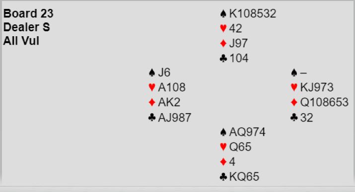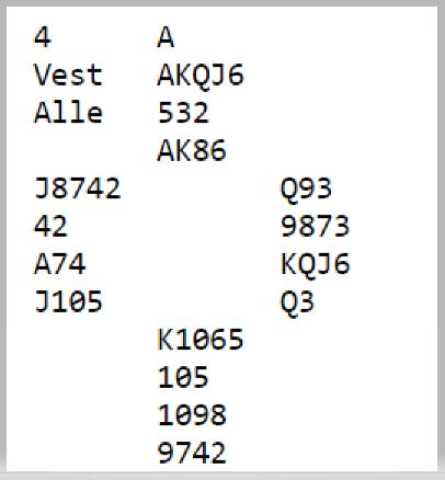 Der Christian Bakke satt øst og Marianne Harding vest startet det med 1 spar fra syd, dobler fra vest og 4 spar fra nord. Nå sa Bakke 4NT – to steder å spille – og vest valgte å vise kløveren. Hun hadde imidlertid nok til å ta sjansen på slem følte hun og sa 6 kløver. Bakke korrigerte til 6 ruter som ba vest velge mellom de to fargene, og 6 ruter ble kontrakten.
