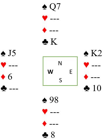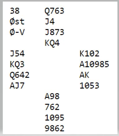 Han spilte ruter til esset, så de to siste hjerterstikkene. To kløver forsvant fra vest. Så ruter konge og kløver til det nå single esset. Ruter dame tok seg av resten av N/S sine rutere så sekseren stod. Dette var igjen: