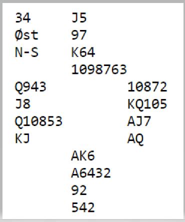 Vest åpner med 1 kløver, eller kanskje med 1 ruter. Og noen valgte sikkert åpningsmeldingen 1NT. Nord melder selvsagt. Og med disse soneforholdene vil ikke syd ti stille heller med hjertertilpasning, N/S er tross alt i gunstig sone.