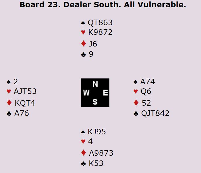 Det var en lang rekke med +1460 for 6 spar med tretten stikk etter hjerterutspill. Å spille den teoretisk korrekte kontrakten 6 spar rmed tolv stikk, og å unngå at de stampet i 7 hjerter ga faktisk litt under middels.