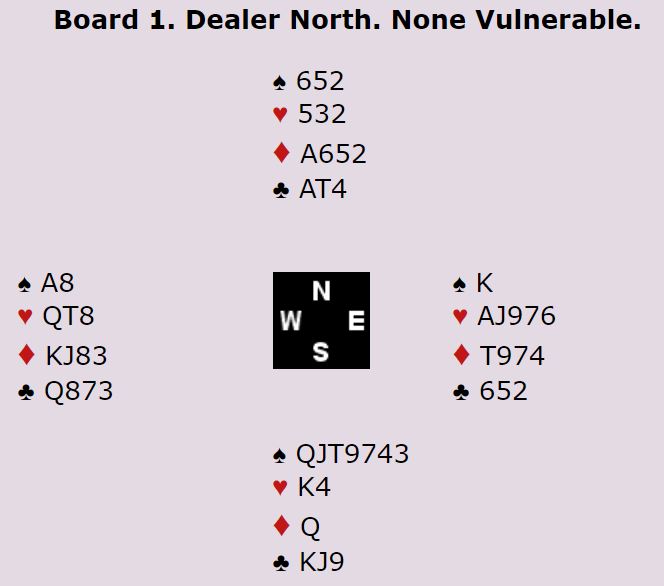 Nord hadde passet først og Syd gjorde det samme, men makker Tone AnnetteOlsen meldte 2 hjerter, overføring til spar , lover 5+ i den fargen men sier ikke noe foreløpig om styrke. Hun hadde: