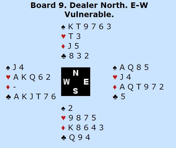 Neste spiller meldte innpå 1 spar og Jon Erik Furunes var aktiv med ved å støtte til 2 hjert5er, Vest bidro med 2 spar og nå kunne Johnsen hoppe til 5 kløver! Det viste renons i kløver og spør etter kontroller utenom kløver og med hjerter som trumf. Syd hadde dette: