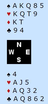 Mot Mikkelsen, Unni (V)- Jan (Ø) fikk jeg en veldig god hånd men valgte ikke å åpne med 1 spar, valgte i stedet 3 spar der jeg satt i 1. hønd med alle i faresonen og hadde: