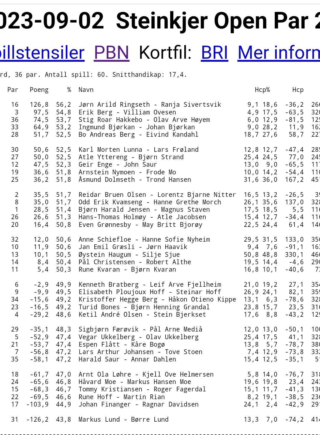 Resultater par lørdag 2.september Resultater lag søndag