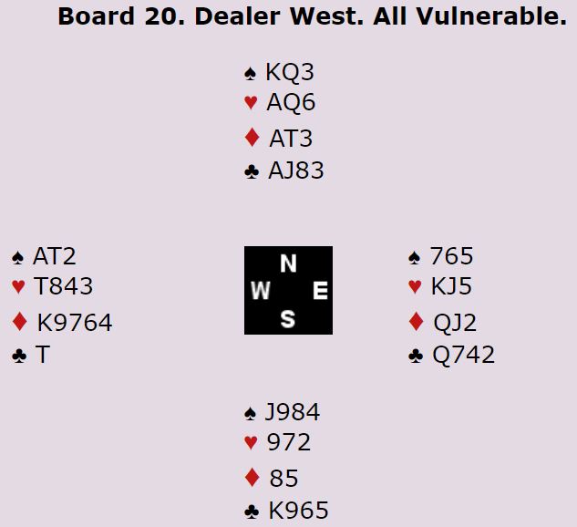 Double Dummy sier 4 ruter hjem, så også kontrakten ved vårt bord etter at vi har presset opp med 3 Hjerter og vest insisterte på ruter uten hjelp fra Øst. Irriterende å ikke få spille, og da la vi på en sløyfe.