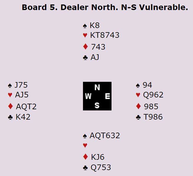 Syd spilte ved de fleste bordene ut sin single hjerter. Mange vant hjerterutspillet med damen og spilte ruter til kongen og esset. Derfra kom hjerter til stjeling, Nå er spillefører i trøbbel og fikk vanskeligheter med å både få tatt kløverfinessen som for så vidt løser den fargen enkelt, og i tillegg tatt to sparfinesser. Slik det gikk var det mange som gikk en bet, og noen gikk to bet i denne normale utgangen.