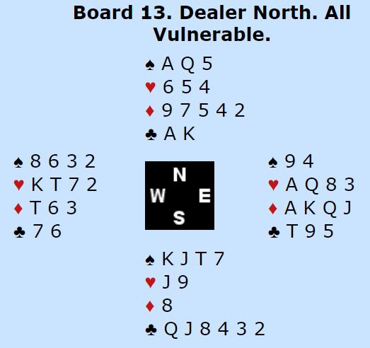 Dette er en glimrende lilleslem i hjerter. Den avhenger av trumfen sitter 2-2 (40%), eller å løse ruterfargen uten taper hvis det viser seg å være en hjertertaper. Slik det satt handlet det om tolv eller tretten stikk siden trumfen satt fint.