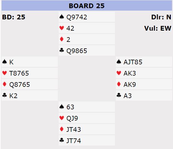 Med denne sitsen blir det bet hvis du forsøker å gardere deg mot Q-J-4-2 i hjerter hos nord og singel nier hos syd. N/S får i tillegg til trumfstikket ett ruterstikk.