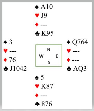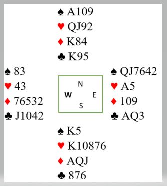 Nord åpnet med 1 i minorfarge, øst meldte inn 1 spar, og syd viste hjerteren. Da han fikk hjerterstøtte avsluttet han med 4 hjerter.