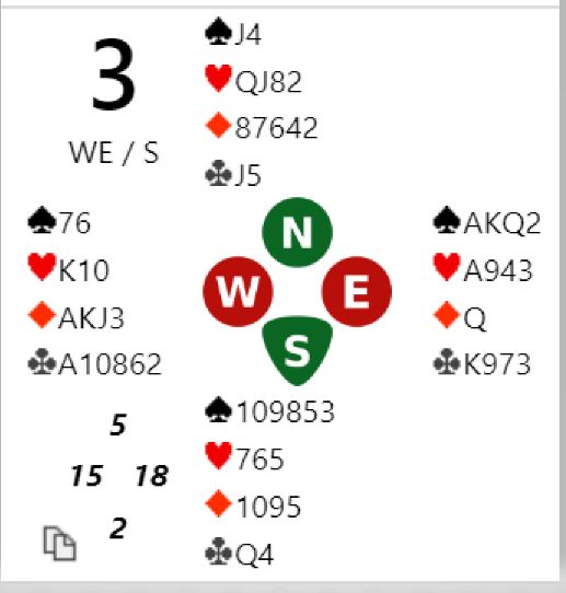 Vel, det kan bli to kløvertapere og bet i lilleslem om man er riktig uheldig. Hvis en honnør legges ned fra det som viser seg å være feil side fordi han bak den andre honnøren har alle fire uteværende kløverne tapes to kløverstikk (om ikke det er en veldig heldig fordeling til så en kan få til innspill for å unngå to tapere i fargen). Det er imidlertid en klassisk safespilling til rådighet her, men da tapes ett stikk hver gang det er tretten stikk, men du får kun tolv.