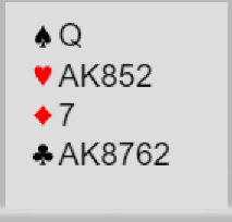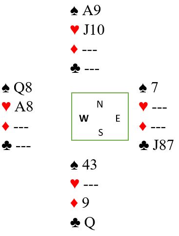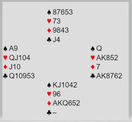 Kløver ess, kløver til kongen og ruter knekt. Syd dekket knekten med kongen, ikke korrekt motspill, med to store til høyre skal man dekke den andre gangen. I dette tilfellet spilte ikke det noen rolle. Det gikk altså ruter knekt, konge ess, ruter til tieren og ruter mot hånden. Det var syv stikk og spillefører hadde også fortsatt hjerter ess. åtte sikre. Nord måtte ned på fire kort og da ble det ikke greit for han som måtte holde 2-2 i majorfargene. Det så slik ut: