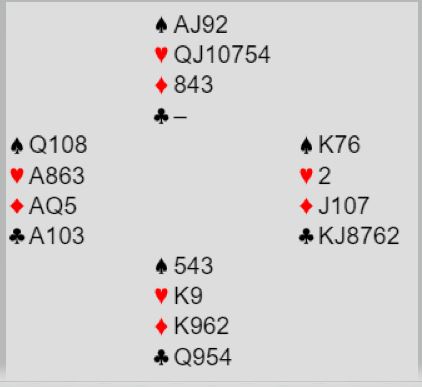 Nord spilte ut hjerter dame. Det er lett å se med åpne kort at liten hjerter i utspill ville vært enda bedre, men det kan man nesten ikke spille ut med slik hjerter, det kan gi spillefører et billig stikk om syd ikke har noe å hjelpe til med i fargen.