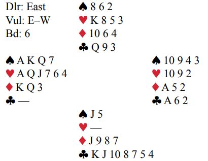 Vests 5 kløver var Exclusion Key Card Blackwood. Øst har to ess, men viste kun ett nøkkelkort utenom kløver som han var bedt om å fortelle om. Vest fortsatte med 6 kløver, storeslemsinvitt. Nå kunne øst ha vist frem hjerter konge om han hadde hatt den og de ville med styring meldt storeslem. Siden øst ikke hadde det kortet slo han av i 6 spar. Bra kontroll på meldingene