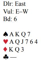 Dette er en fin 6 hjerter eller 6 spar. Det er ikke så lett å melde med kontroll etter motpartens sperreåpning. Men de fikk sjekket det meste, også om det kunne være en nedlegg storslem. Øst kunne jo godt hatt hjerter konge i stedet for kløver ess. Slik gikk meldingene: