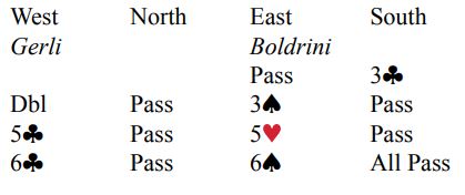 Vi tar med et spill Gerli fortalte i bulletinen. Det var et fint meldingsforløp hvor han og makkeren i den turneringen, Andrea Boldrini var helt på bølgelengde.