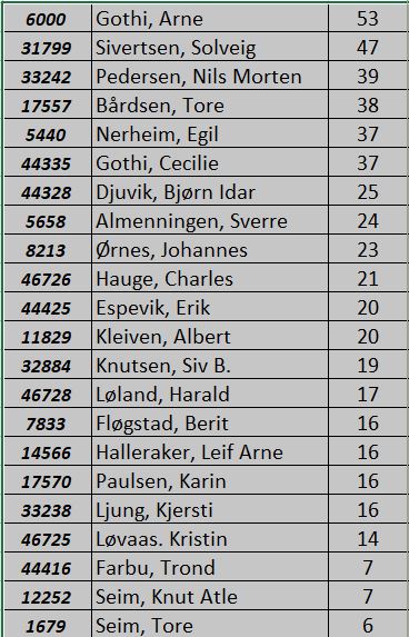 Det ble seier til Olav og Asbjørn med 64,6%. På 2. plass fulgte Sigurd og Marius med 63,2%. Eller ble det kamp om "pallen". Pallplassen gikk til Ronny oh Bjarne med 56,3%.
