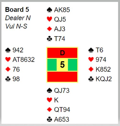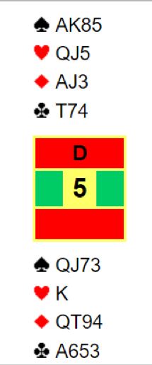 Øst får første stikk for kløver konge og fortsetter fargen. Vest vinner så for hjerter ess og spiller ruter, men du går opp med esset og tar ut trumfen, så QJ i hjerter med avkast av to kløvere fra syd. Deretter får Ø/V kun for ruter konge - ti stikk.