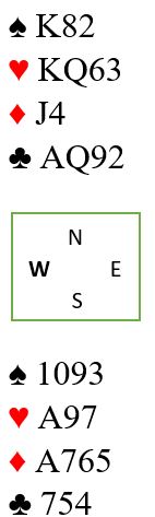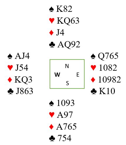Sett deg selv i østs situasjon ved å holde over syd og vest sine kort, for husk øst ser kun sine egne kort og nord sine. Så spilles altså liten kløver fra nord. Ikke så enkelt å legge tieren som det er med åpne kort?
