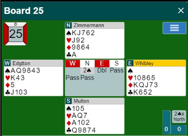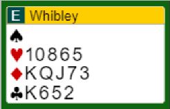 Whibley (NZ) doblet imidlertid Zimmermanns 2 sparåpning ved det andre bordet, og for en gangs skyld er jeg uenig med den normalt meget gode spilleren. Selvsagt er jeg påvirket av det som skjedde videre. Selv om han visste doblingen kan gå bra selv om makkeren straffepasser er det skummelt, og jeg tipper at Whibley bet seg litt i leppen da akkurat det skjedde. Han spilte ut ruter konge mot 2 spar doblet, og hele spillet så slik ut: