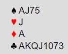 Men selv om makker bare høyner til 4 spar over 3 spar går du selvsagt på med 4NT – Key Card Blackwood. Da får to 5 spar fra syd, to nøkkelkort og trumf dame. Følgelig har han spar konge-dame og hjerter ess. Mer behøves ikke, det er ikke lenger noe problem, for du kan telle tretten sikre stikk (4 sparstikk, hjerter ess, ruter ess og 7 kløverstikk). Konklusjon 7NT, det kan ikke være noe å spille om i den kontrakten.