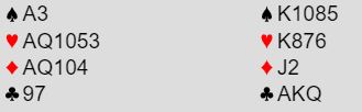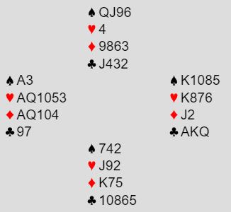 Ved det andre bordet passet vest da syd åpnet med 1NT uten at jeg vet sikkert hvorfor. Kanskje var det pga. av systemvarianter, for eksempel dobling viste noe annet enn sterke kort, og 2 ruter også noe annet enn ruter? Eller kanskje vest bare hadde et litt romantisk håp om å få spille motspill mot grandkontrakt? Det videre meldingsforløpet ble imidlertid kort: