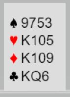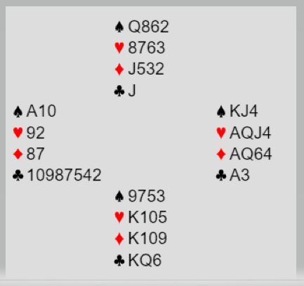 Spillefører ser ikke alle kortene sånn som oss, men kan tenke omtrent slik: Det er klart syd er renons i ruter siden det ikke kom ruter i utspill. Hvis trumffargen ikke gir en taper er det håp. Nå handler det litt om hvem som har kløver konge, men det kortet er sannsynligvis plassert hos syd. For med AQJ-åttende i ruter og kløver konge er vel nord for sterk for åpningen 4 ruter?