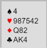 I denne given kommer de fleste i 3 grand på øst sin hand. Standardutspillet er en liten hjerter fra syd. Nieren legges i bordet, og øst stikker hjerter 10 fra nord med knekten. Øst tenker at nord/syd mest sannsynlig kan hente fire hjerterstikk. Hvis ikke kløverdame sitter dobbel trengs det derfor i tillegg til fem sparstikk et stikk i ruter for å klare kontrakten. Oddsen for kløverdame dobbel er nokså liten. Øst kan i stikk to derfor forsøke en ruter med håp om at syd med esset ikke stikker opp. Det går bra ved enkelte bord, men fortsatt gjenstår et dilemma. Øst kan toppe sparen, som får med seg 3-3 sits hos motparten, eller knekten dobbel i syd. En annen løsning er etter sparess er å ta finessen med tieren i tilfellet knekten sitter fjerde i nord – to nokså like en muligheter. Kontrakten gikk hjem (med overstikk) kun ved ett bord. Men det eneste paret som meldte den utgangen som sto var Per Schjelderup – Rolf Jacobsen. 4 spar er ubetelig! Per fikk 10 stikk (med heldig trumfbehandling er det elleve), og kunne med det innkassere en fortjent nest topp på spillet.