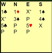 Kaja Brekke (vest) sin dobling av 1 spar var støttedobling som viste eksakt trekorts hjerter. Idet N/S var i 4 spar fikk Kaja vist sine kort godt med meldingen 5 kløver. Vegard korrigerte til 5 hjerter. Syd som satt med tre ess og en makker som hadde vært med i meldingene syntes at nå fikk det være nok: dobler.