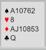 Etter å ha svart 2 ruter ble det litt brutalt å vise sparfargen på fem-trinnet. Det kan bli helt fryktelig hvis N/S ikke har tilpasning verken i spar eller ruter. Det ble altså særdeles ekkelt for nord dette. Han valgte å doble, og da gikk det pass rundt. Det må da bli noen beter i dette, nord har tross alt to ess og en makker som har åpnet? Men nei...