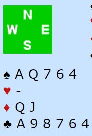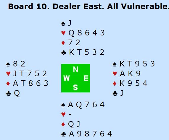 Når jeg hevdet 6NT kanskje er vel så bra som 6 spar er det en sannhet med visse modifikasjoner. For i 6 spar er det en ekstra sjanse, N/S må få med seg for ruter ess, for hvis ikke de gjør det forsvinner østs ruter på hjerter.