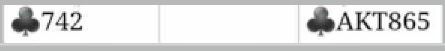 Det ser nesten ut som det ikke behøves noen spilleplan her, 6 spar ser ganske nedlegg ut. Det blir tretten stikk om trumfen sitter 2-2. Men hva om nord har alle de uteværende trumfene? Det er i utgangspunktet en veldig liten sjanse for det når vi har en farge med ni kort til sammen, men litt mer sannsynlig i denne konteksten hvor syd har vist en veldig lang kløverfarge.