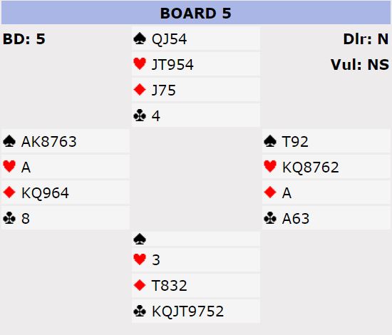 Jo, ved det bordet hadde syd åpnet med 2 hjerter som viste femkorts hjerter og minst firekorts minorfarge. Det er ni kort, og da spillefører tok noen sparrunder ble det oppdaget at syd hadde trekorts spar og nord to. Det betyr at at tolv kort kort er plassert hos syd. Og det er vel langt i fra usannsynlig at han har 5-5 i stedet for 5-4 i rødfargene, og følgelig 3-5-5-0?