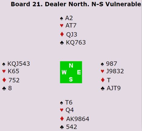Etter 1NT fra Lahrmann (nord) og 3NT fra Nicolai (syd) meldte Peter Bertheau (vest) friskt 4 spar. Han var tross alt i gunstig sone, og han var heldig med øst sine kort. Slik det sitter blir det kanskje kun en bet i 4 spar om det blir kontrakten.