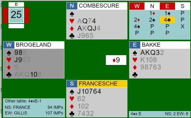 Ved det andre bordet ble det også spilt 4 spar doblet med samme start på motspillet. Men der la spillefører ned en sparhonnør før en ruter ble stjålet hos vest, og da ble det igjen kun singel nier hos vest. I suttposisjonen kan da syd trumfe med tieren og så presse ut den single nieren med knekten slik at det blir to trumftapere. Dermed ble det -200 der og 14 IMP til lag GILLIS.