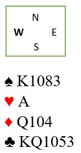 Du ser faren med dine to små ruter, men ser ikke veien til en kontrollert grandkontrakt med hold i alle farger. 3K er ikke krav hos oss, mer en invitt. Kunne kanskje meldt 2H som rundekrav, men hva så? Her kommer 2S svar fra makker og du er vel like langt om du ikke heter Jan Talberg og ser ditt snitt til å endelig få spille på 4-3 tilpass. OK Jan, hører deg si at det nettopp er toppkontrakten. Lødding og Didriksen kom dit og plukket med seg de minimum 12 stikkene som er der for en ensom topp. Og vi en ensom bunn etter at øst-vest selvsagt plukket beitene.