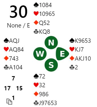 De aller fleste havner vel i 6 spar som Ø/V. Og det gjorde de fleste i Bodø også, kun ett par var i utgang. Men ett par til hadde et annet resultat enn +1010 som det blir i 6 spar hvor ruterfinessen går og gir det trettende stikket. Klukowski-Helgemo var i 7 hjerter med kun 4-3 tilpasning i trumf!