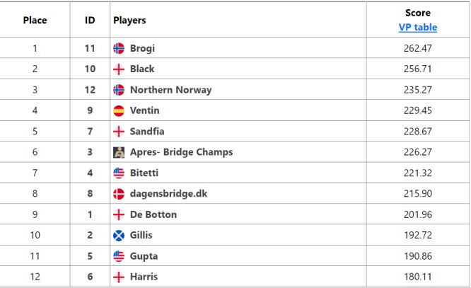 Lag BLACK ligger på 2.plass og NORTHERN Norway med mange norske spillere på 3.plass før avslutningsdagen. I en av kampene torsdag møtes BROGI i NORTHERN NORWAY. Den kampen tipper jeg blir overført på BBO fra kl. 11.25.