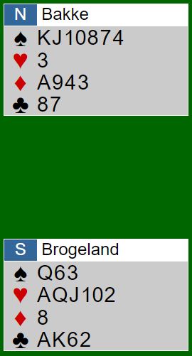 Bakke stakk og stjal en ruter. Så hjerter ess og hjerter til stjeling fulgt av nok en ruterstjeling. Så A-K i kløver og kløver til stjeling, begge fulgte tre ganger kløver. Den siste ruteren ble stjålet, og nå var det ikke noe problem lenger siden hele spillet så slik ut: