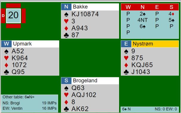 I den siste kampen kom det til slutt to slemspill. Først en nokså vanlig 6NT som ble meldt og vunnet på ni av de tolv bordene. Så kom en 6 spar som så slik ut: