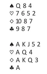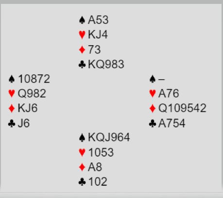 Den syd-spilleren som var i 6 spar gikk altså bet. I 4 spar ved det andre bordet stakk spillefører utspillet, spilte spar ess og spar til damen (begge fulgte to ganger trumf) fulgt av hjerter til damen. Så, med en trumf ute, ble det spilte A-K-Q i ruter fulgt av den fjerde ruteren til stjeling - tolv stikk.