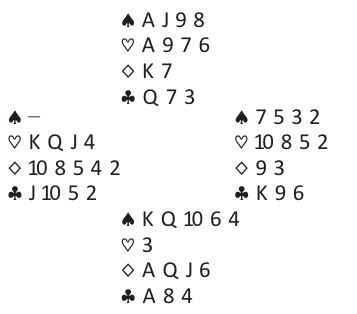 Hvis en etter å ha vunnet med hjerter ess i første stikk spiller spar ess oppdages at øst har alle de fire uteværende trumfene. Da er det plutselig ikke så enkelt, for om trumfen tas ut i fire runder blir det ikke trumf igjen til å dekke opp syds kløver. Selvsagt kan vest ha kløver konge, men hvis øst har det kortet er det med slik spilleføring fare for to kløvertapere. La oss si det sitter slik fra start: