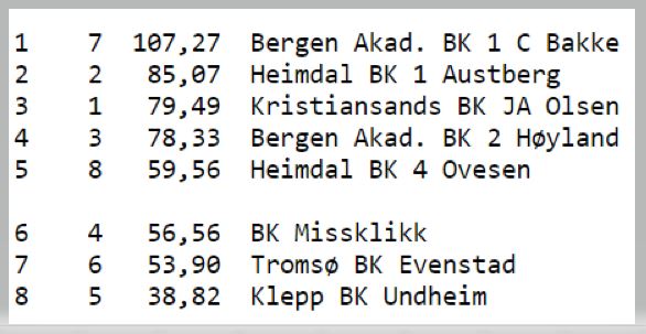 I forrige innlegg antydet vi at det godt kunne bli dobbelt BAK da Bergen AK 2 (Høyland) lå på 2.plass før siste kamp, og de hadde en bra luke ned til forfølgerne. Men slik ble det ikke. Bergen AK 2 fikk i avslutningskampen juling mot BK Missklikk, arrangørens lag. Og det benyttet både Heimdal BK 1 (Austberg) og Krisitiansand BK (Olsen) seg av da de lagene fikk opp store seiere til slutt og smatt forbi Bergen AK 2 med medalje som resultat.