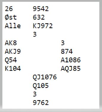 Så langt har øst fortalt at han har kun trekorts hjerter og samtidig at han har femkorts kløver og neppe en helt jevn hånd da med det kunne han ha meldt 1NT i stedet for 2 hjerter.